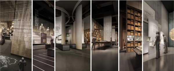 藍(lán)灰色空間營(yíng)造逼迫、緊張的空間氛圍,兩側(cè)展墻象征國(guó)土分離、家園破碎,璦琿條約劃界圖用精確投影展示。